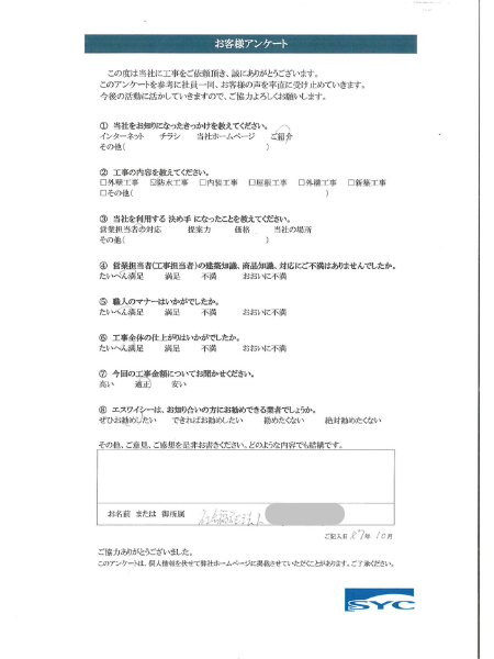 営業担当者の対応、施工の仕上がり職人の対応など、一つ一つの項目に評価を頂くことにより、お客様へさらなる質の高いサービスと塗装を届けたいと考えております。